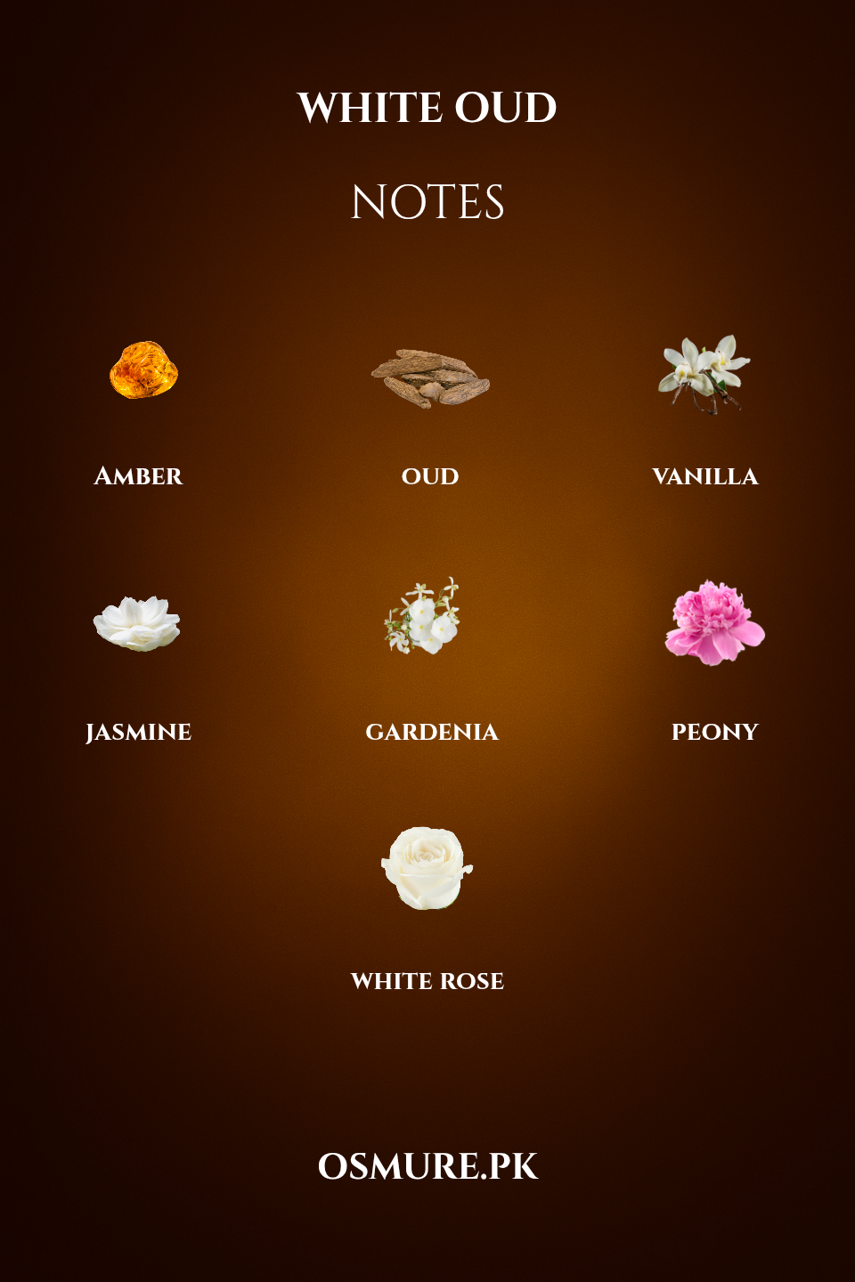 Step into graceful elegance with White Oud, a refined floral-woody fragrance that captures purity and depth in perfect harmony. The scent opens with luminous white rose, delicate gardenia, and soft jasmine, offering a fresh yet luxurious introduction. At its heart, blooming peony, osmanthus, and magnolia create a floral bouquet full of sophistication and charm. Finally, the fragrance melts into a warm base of amber, musk, rich agarwood (oud), and bourbon vanilla, leaving a sensual and lasting impression.